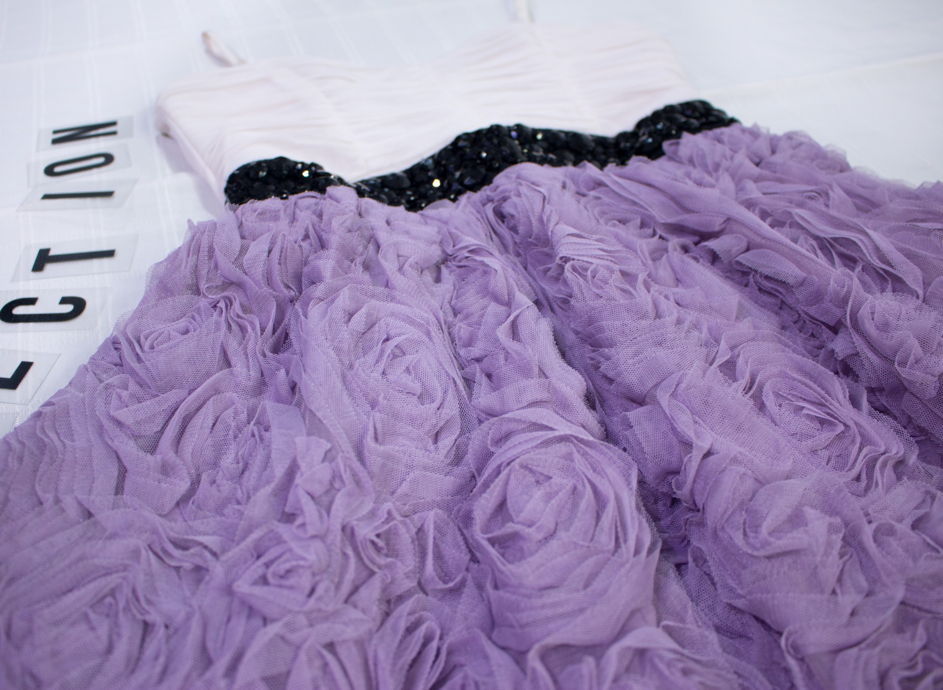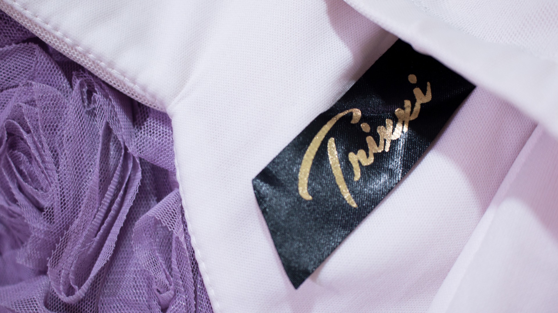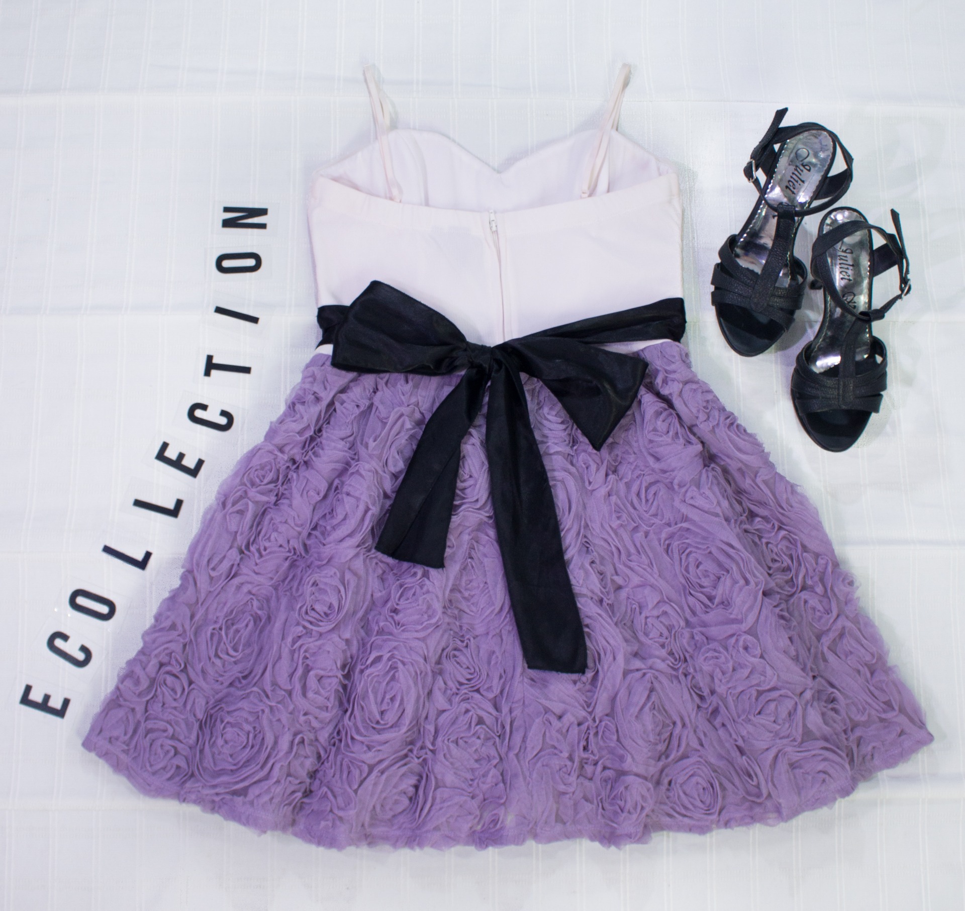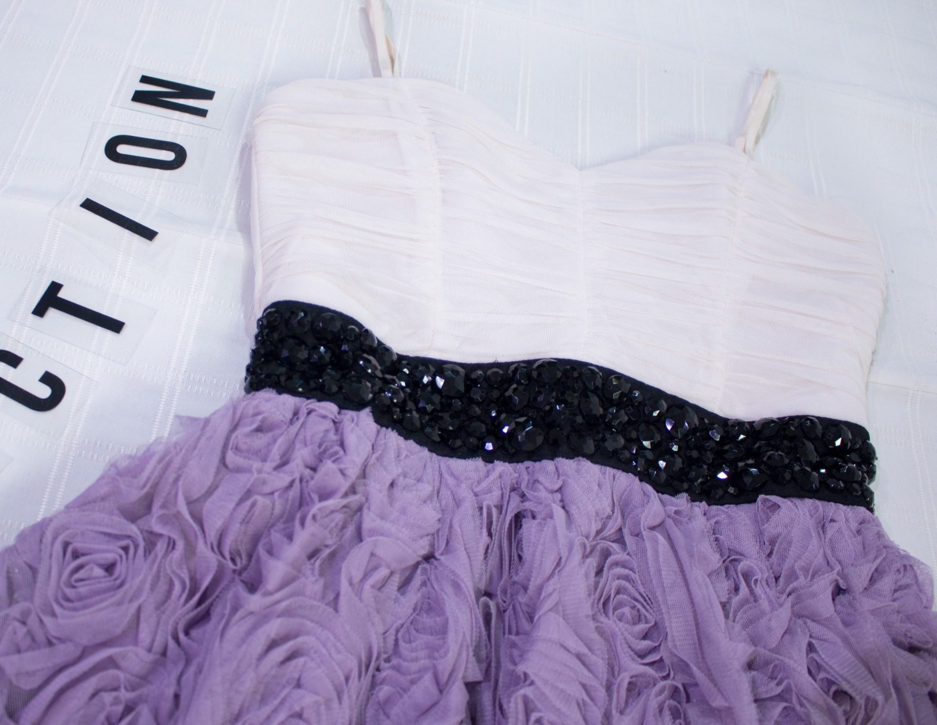Doble tela en la parte superior del vestido, cinturón negro con piedras incrustadas por el frente y con tela de seda por detrás. Tiene tiras ajustables y un cierre en la espalda. Marca 'Trixxi'.
